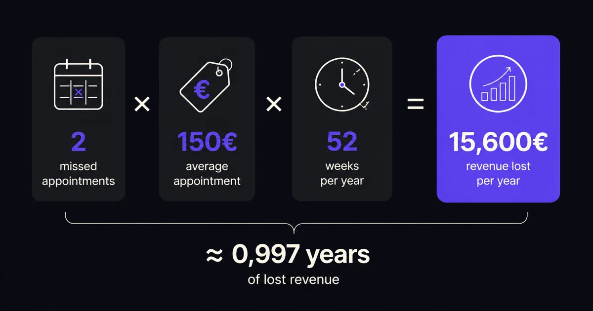 Cela dépend de la valeur moyenne d'un rendez-vous et de la fréquence des absences. Par exemple, deux rendez-vous manqués par semaine à €150 chacun représentent €15,600 par an. C'est un calcul indicatif, pas une moyenne officielle.