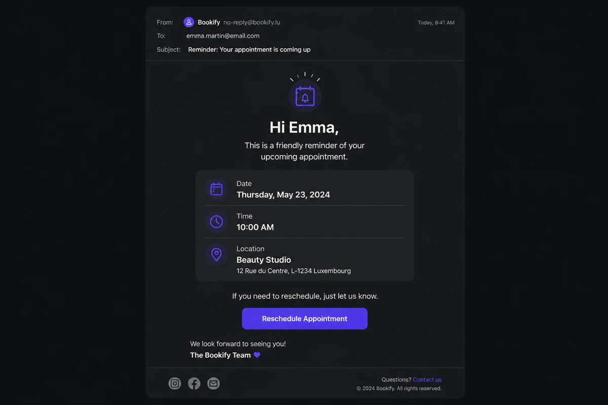 Pour les entreprises au Luxembourg qui servent des clients multilingues, une page de réservation claire peut afficher les services, tarifs, disponibilités, options de langue, règles d'annulation et conditions de paiement avant même que le client prenne contact.